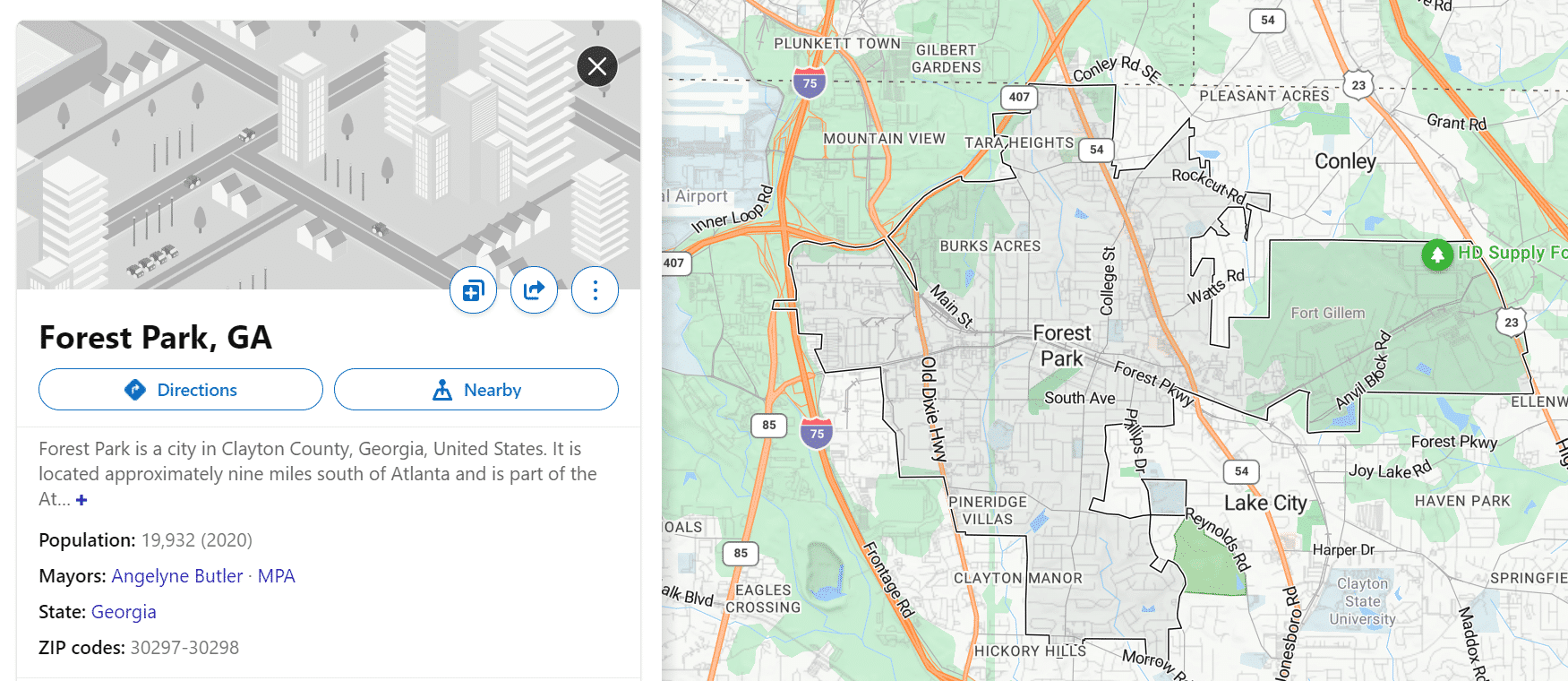 Learn More About Forest Park on Wikipedia.com Open & Explore Forest Park Google Map on maps.google.com Locate Nearby Forest Park Google pharmacies on google.com Browse List of Forest Park public and private schools on GreatSchools.Org View Current Forest Park weather report weather.com