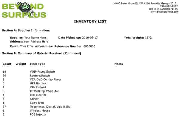 When you choose Beyond Surplus for asset management solutions you will have the option to receive a Certificate of Recycling & Data Destruction at no cost. For a nominal fee, you can receive a basic inventory list to include only the quantity and type of each item. A Serialized Inventory List to include the Item, type & Serial Number of each asset is available for HIPAA compliance